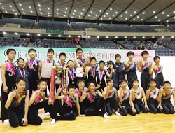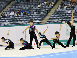 日本発祥のスポーツで、体操競技の一つであり、技術や芸術性などを競うスポーツです。「団体競技」と「個人競技」があり、団体は手具は使わず、6人が音楽に合わせてアクロバティックで力強い演技をします。個人はスティック・リング・ロープ・クラブの手具を使って演技します。
